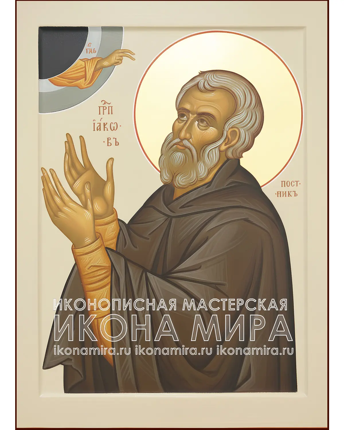 Рукописная икона Преподобного Иакова Постника, подвизавшегося на Кармиле в Палестине, посвящена святому строгого подвига, непрестанной молитвы и глубокого воздержания. Его духовный путь связан с уединённой жизнью, сосредоточенной на внутреннем делании и полном уповании на Бога.