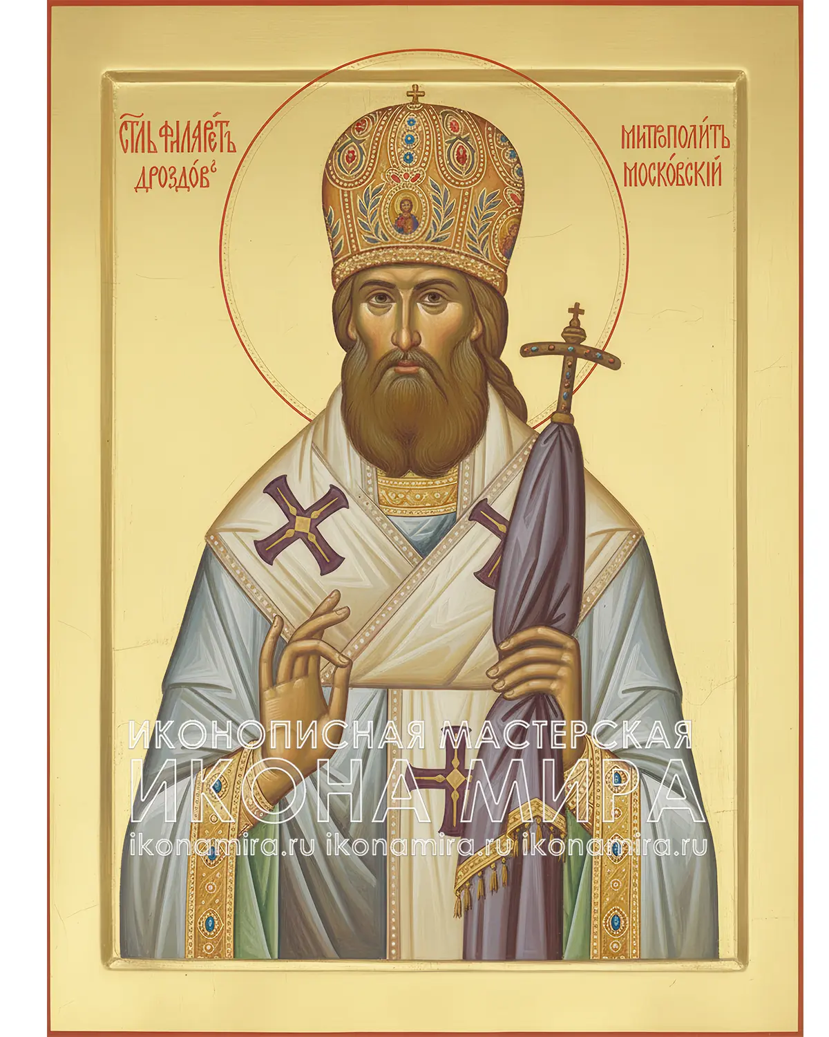 Святитель Филарет, митрополит Московский (в миру — Василий Михайлович Дроздов) родился 26 декабря 1782 года в селе Коломне, в семье священника. С юности отличался благочестием, любовью к учению и глубоким умом. Получив духовное образование, он стал преподавателем в Санкт-Петербургской духовной академии, где проявил себя как выдающийся богослов и наставник. Его дар слова и мудрость быстро привлекли внимание духовного начальства. Филарет был рукоположен во священство, затем принял монашеский постриг, и в 1821 году был возведён в сан митрополита Московского. На этом поприще он почти полвека был духовным светильником России. Его жизнь отличалась строгим подвижничеством: он жил очень скромно, много молился, избегал славы и роскоши.