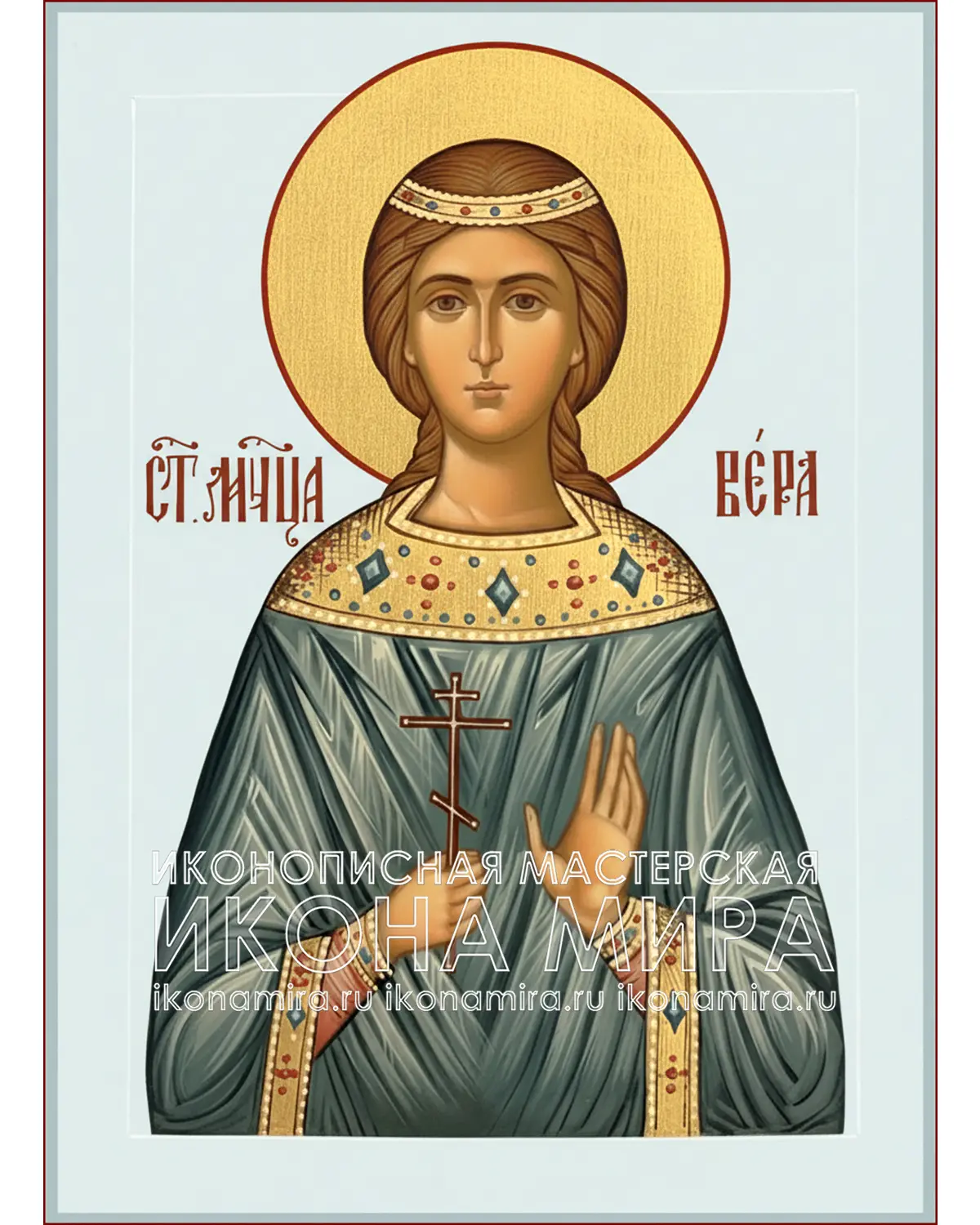 Образ Святой Мученицы Веры пишется в соответствии с канонической иконографией мучениц: светлые одежды, крест как символ исповедания Христа, нимб как знак святости. Золочение подчёркивает духовное сияние святой, а гармоничная цветовая гамма передаёт чистоту, юность и внутреннюю силу образа.